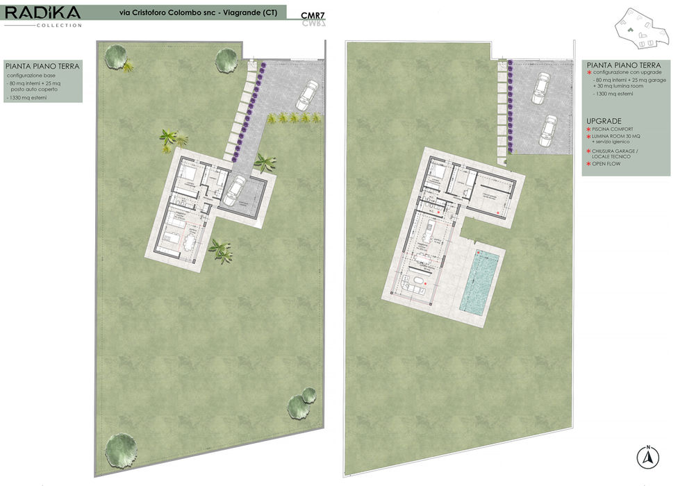 La villa monolivello singola CMR 7 della Collezione Radika è costituita da 80 mq interni oltre 25 mq di posto auto coperto, per un totale di 105 mq coperti.